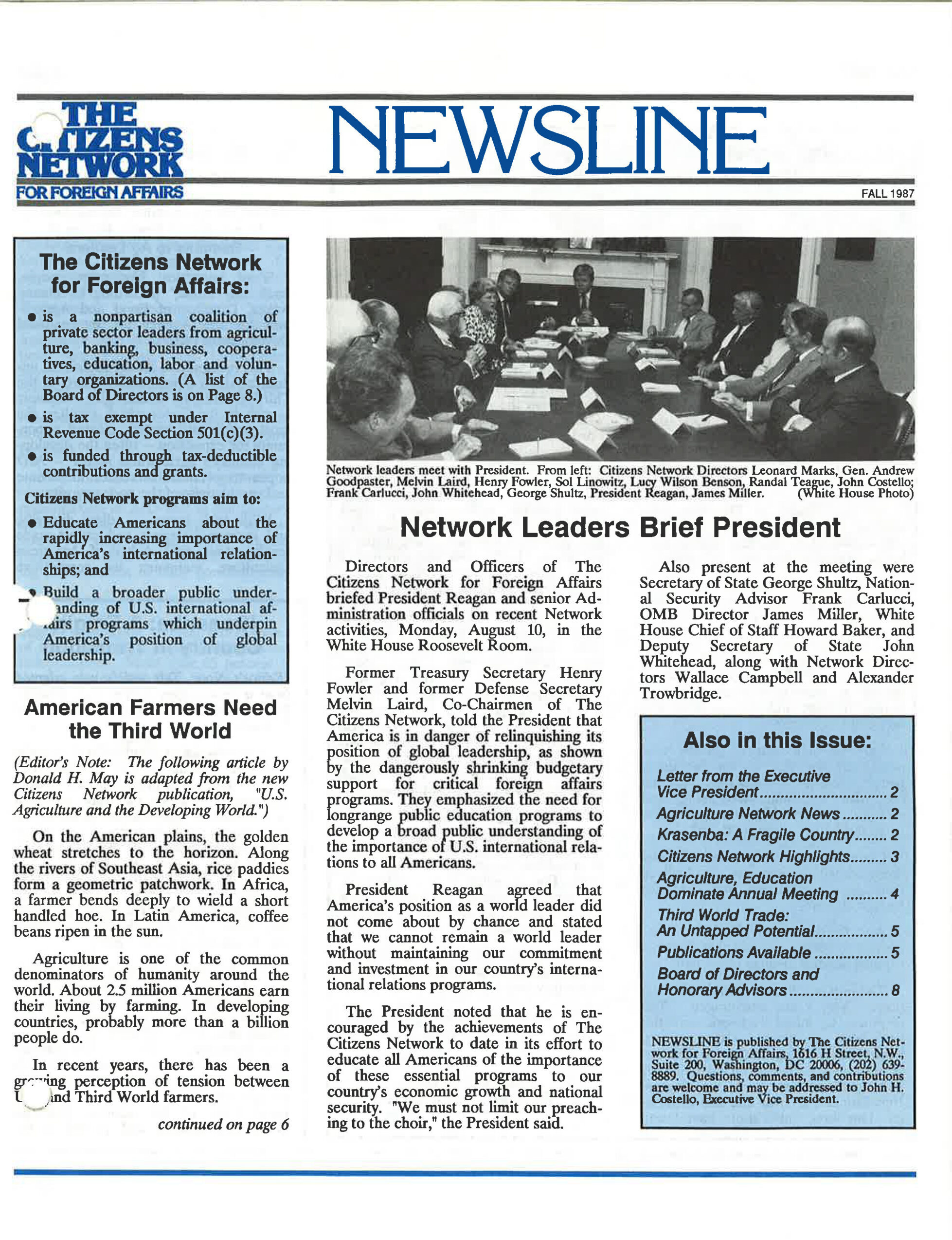 CNFA convenes its inaugural policy conferences and roundtables, bringing together U.S. farmers, agribusiness leaders, policymakers, and development experts. These dialogues, including discussions at the White House with President Ronald Reagan, Secretary of State George P. Shultz, and key business leaders, help to advance private sector-led approaches to agricultural development.